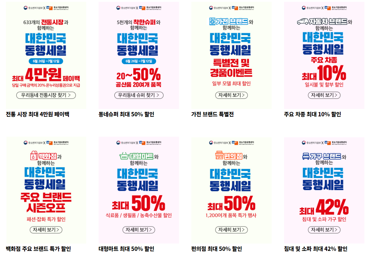 대한민국 동행세일이라고 들어보셨나요? 정부에서 경제위기를 극복하고자 정부차원에서 실시하는 일명 '대한민국 동행세일'을 6월 26일부터 7월 12일까지 시행합니다. 온. 오프라인 구분 없이 많은 업체들이 참가하는 이번 대한민국 동행세일에 대한 정보를 간단하게 알려드리도록 하겠습니다.